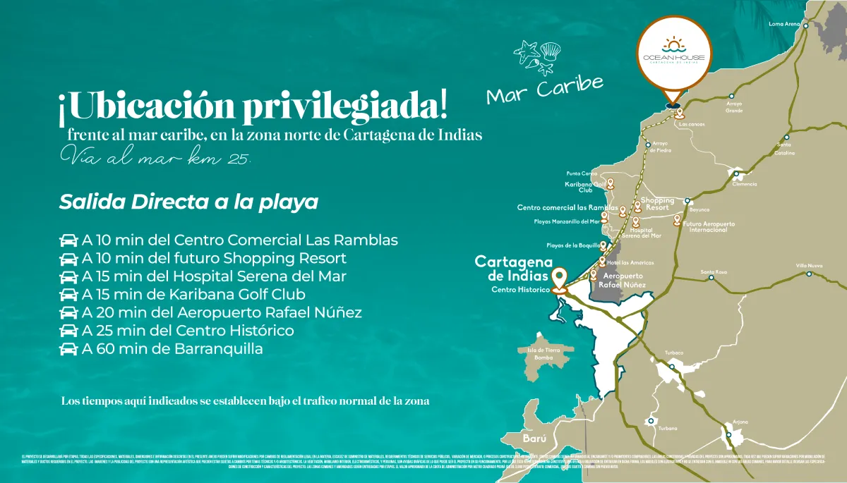En la zona norte de Cartagena de Indias, Sector Las Canoas, Vía al mar, Kilometro 25, a 10 minutos del Centro Comercial las Ramblas, a 20 minutos del Aeropuerto Rafael Núñez y a 25 minutos del Centro Histórico de Cartagena.